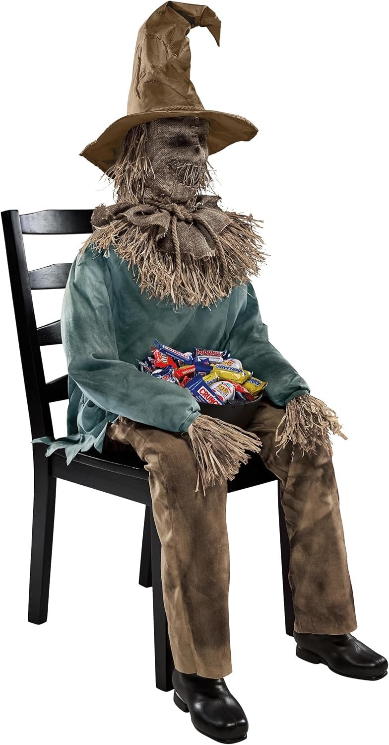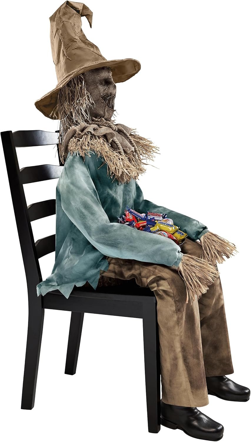 Bring spooky fun to your Halloween with the Spirit Halloween 4.5 ft Sitting Scarecrow Animatronic. Featuring motion-activated pop-up action, a candy bowl prop, and realistic fabric and metal details, it delivers a memorable surprise for guests. Lightweight and easy to set up with adapter or remote control, this animatronic is perfect for indoor or covered outdoor displays—add a thrilling centerpiece to your Halloween décor today!